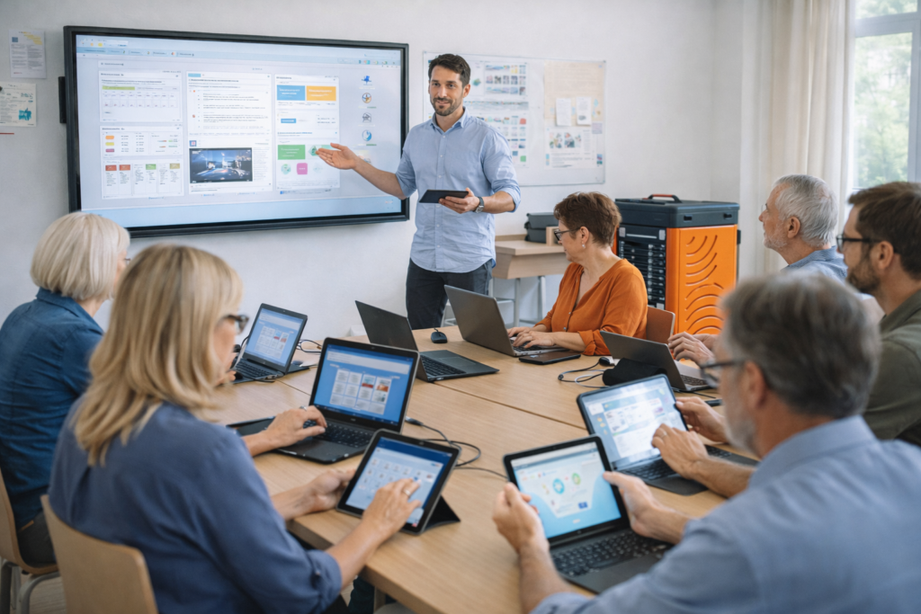 Capacitación Docente Aseguramos el uso correcto de la tecnología en el aulaCapacitamos a los docentes para que puedan aprovechar al máximo las herramientas tecnológicas, facilitando su integración en el proceso educativo y mejorando la experiencia de enseñanza. Uso eficiente de la tecnología Mayor confianza del docente Integración real en clases Mejora en metodologías educativas Solicitar Capacitación Beneficios